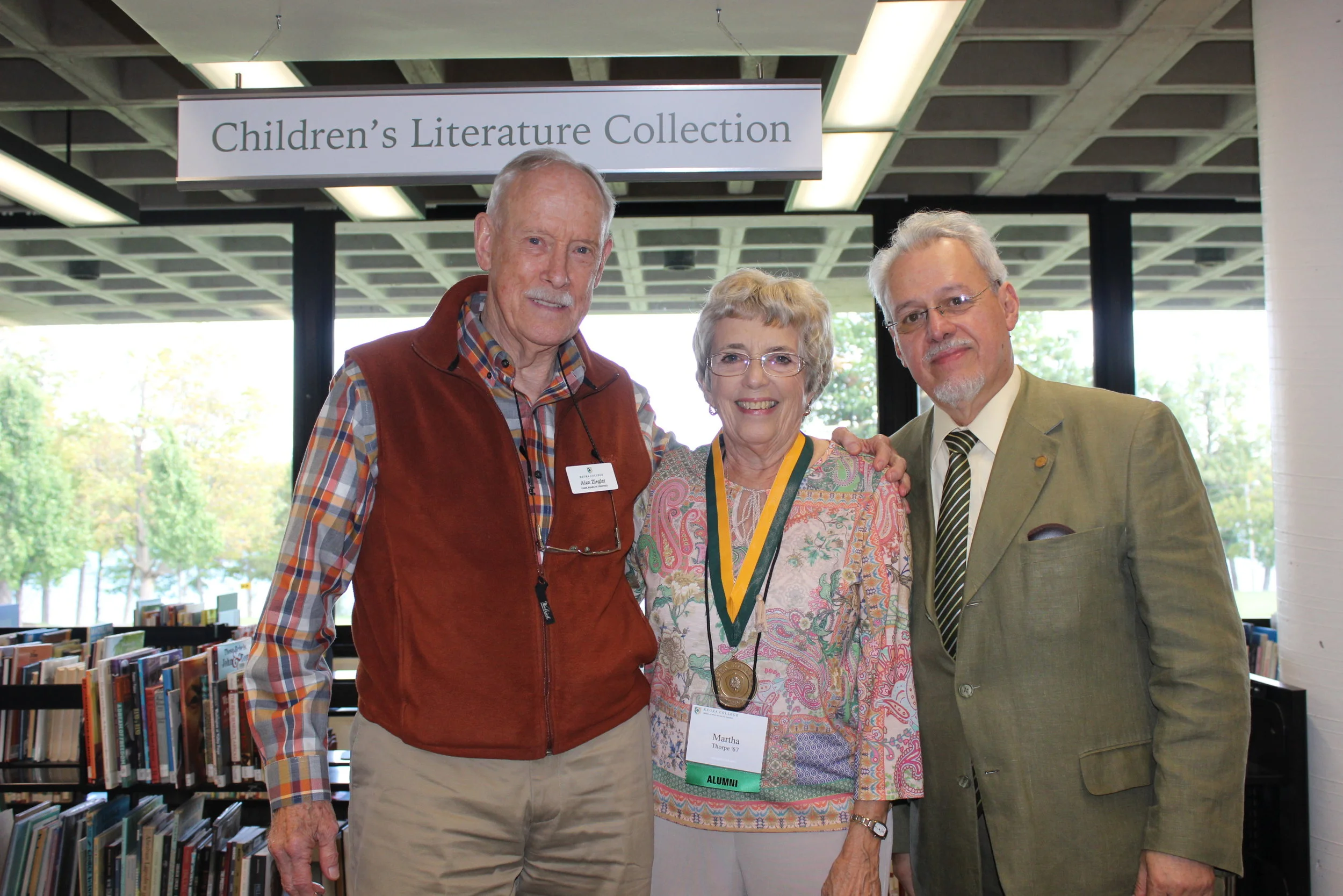 The first event was the Pathfinders Luncheon held in Lightner Library with a panoramic view of Lake Keuka. As newest Pathfinders (alums of at least 50 years) we enjoyed lunch and the opportunity to chat and compare notes with folks from previous classes. To celebrate our status each of us was presented with a Green and Gold medallion necklace and had photos taken with President Dr. Jorge Díaz-Herrera and Board Chair Alan Ziegler. Class President Kathy Sims Ginett presented Dr. Díaz-Herrera with a green and gold leather portfolio of documents pertaining to our Class Gift “The Signature Field Period Scholarship”, which also included a gold embossed binder for future recipients’ Field Period application, essay and follow-up report. Afterwards, our official class reunion photo was taken outside Ball Hall.